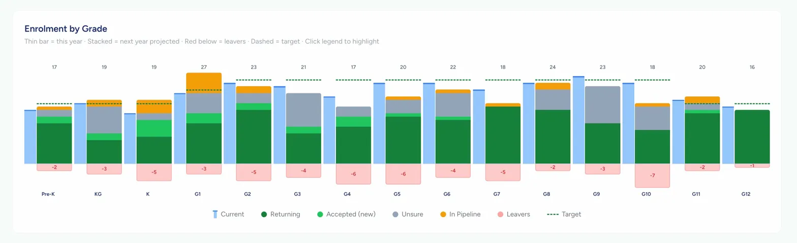 The Enrolment by Grade chart shows your whole school on a single canvas. Current year as a thin blue bar, next year projected as a stacked column, leavers below the baseline, and your target as a dashed line. Seven legend items are individually clickable, fading everything else to reveal the signal you're looking for.